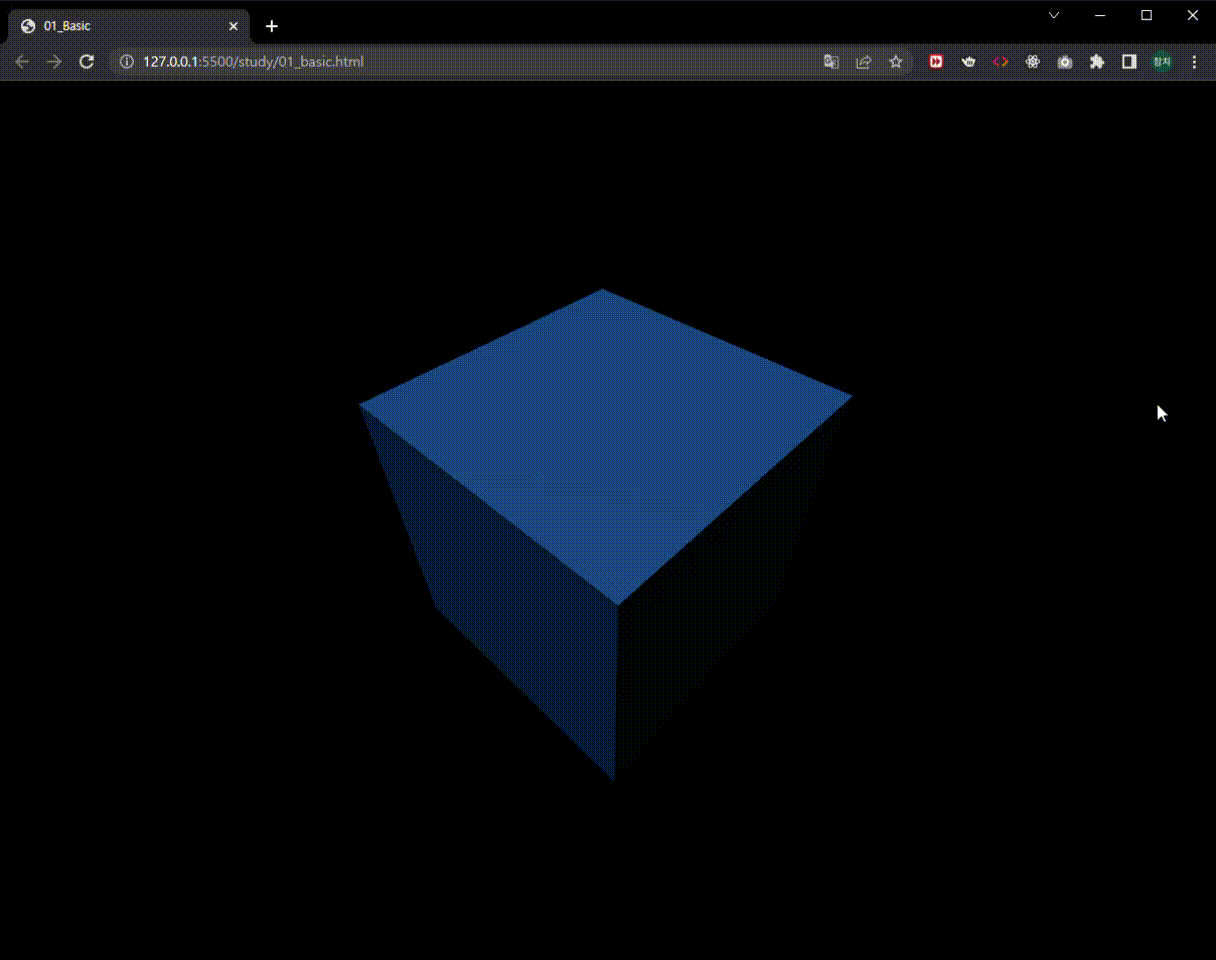 <!-- study/01_basic.html --> <!DOCTYPE html> <html lang="en"> <head> <meta charset="UTF-8"> <meta http-equiv="X-UA-Compatible" content="IE=edge"> <meta name="viewport" content="width=device-width, initial-scale=1.0"> <title>01_Basic</title> <link rel="stylesheet" href="01_basic.css"> <script type="module" src="01_basic.js" defer></script> </head> <body> <div id="webgl-container"></div> </body> </html>/* study/01_basic.css */ * {outline: none; margin: 0;} body {overflow: hidden;} #webgl-container {position: absolute; top: 0; left: 0; width: 100%; height: 100%;}// study/01_basic.js import * as THREE from '../build/three.module.js'; class App { constructor() { const divContainer = document.querySelector('#webgl-container'); this._divContainer = divContainer; const renderer = new THREE.WebGLRenderer({antialias: true}); renderer.setPixelRatio(window.devicePixelRatio); divContainer.appendChild(renderer.domElement); this._renderer = renderer; const scene = new THREE.Scene(); this._scene = scene; this._setupCamera(); this._setupLight(); this._setupModel(); window.onresize = this.resize.bind(this); this.resize(); requestAnimationFrame(this.render.bind(this)); } window.onload = function () { new App(); }여기서 01_basci.html 파일의 아래 부분을 보면 script를 module 타입으로 import 하고 있는데